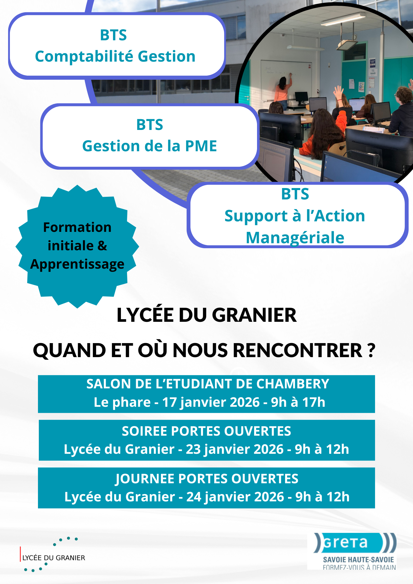 🤝 Venez rencontrer les équipes et les étudiants des BTS CG, GPME et SAM du LYCEE GENERAL & TECHNOLOGIQUE DU GRANIER lors des soirée et journée portes ouvertes du 23 et 24 janvier 2026 !