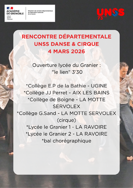 Par ADELINE BERTRAND, publié le mardi 10 février 2026 15:23 - Mis à jour le mardi 10 février 2026 15:23Venez assister au spectacle de la rencontre départementale UNSS danse et cirque le 4 mars 2026 à l'Espace Jean Blanc de La Ravoire, à 18h30 -